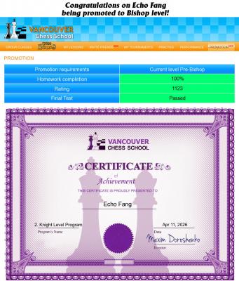 Vancouver chess school is a top quality chess school in the lower mainland. It provides systematical training to students through excellent teachers. For only two years, my kid improves a lot and beco...