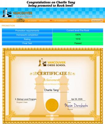 Vancouver Chess School is an absolutely wonderful school for kids. Moving up from lower level class (Pawn) to higher ones ( Bishop) is a good way to build children’s motivation. All coaches and staf...